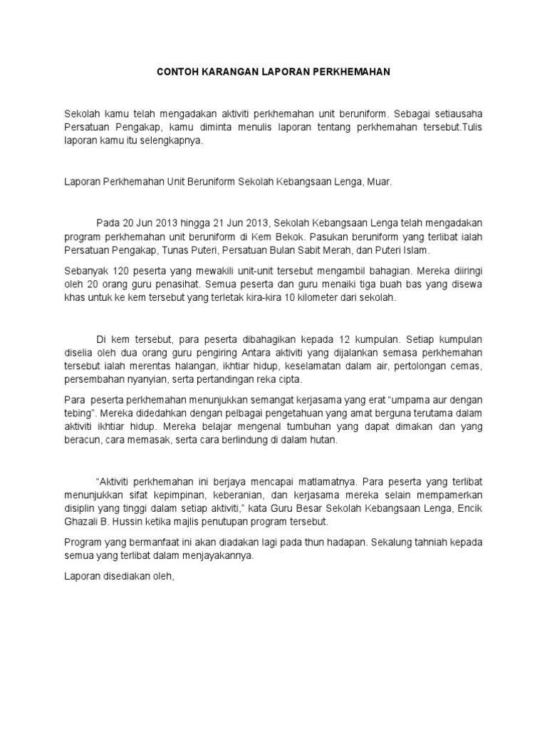 Kamu perlu memastikan jenis laporan sama ada laporan aktiviti persatuan perayaan sambutan perasmian atau lawatan ke sesuatu tempat. Selain itupihak sekolah boleh mengadakan perkhemahan bagi membina jati diri setiap pelajarDi samping ituaktiviti tersebut juga boleh mendisplinkan pelajar. Aktiviti Meredah Hutan 3.